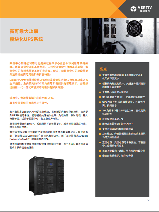 數(shù)據(jù)中心的持續(xù)可靠運行是保證客戶核心業(yè)務(wù)永不間斷的關(guān)鍵保障。隨著公司業(yè)務(wù)的不斷發(fā)展,支持業(yè)務(wù)運營平臺的基礎(chǔ)架構(gòu)—數(shù)據(jù)中心的規(guī)模也需要不斷擴(kuò)容升級。所以,新數(shù)據(jù)中心的建設(shè)需要關(guān)注系統(tǒng)的高可用性和易擴(kuò)容特性。 Liebert APM 50~600KVA智能模塊化UPS系統(tǒng)是維諦技術(shù)集40余年大功率UPS生產(chǎn)經(jīng)驗,業(yè)內(nèi)領(lǐng)先的IDC動力保障和智能供電管理技術(shù),全新推出的新一代一體化IT機(jī)房不間斷供電解決方案。