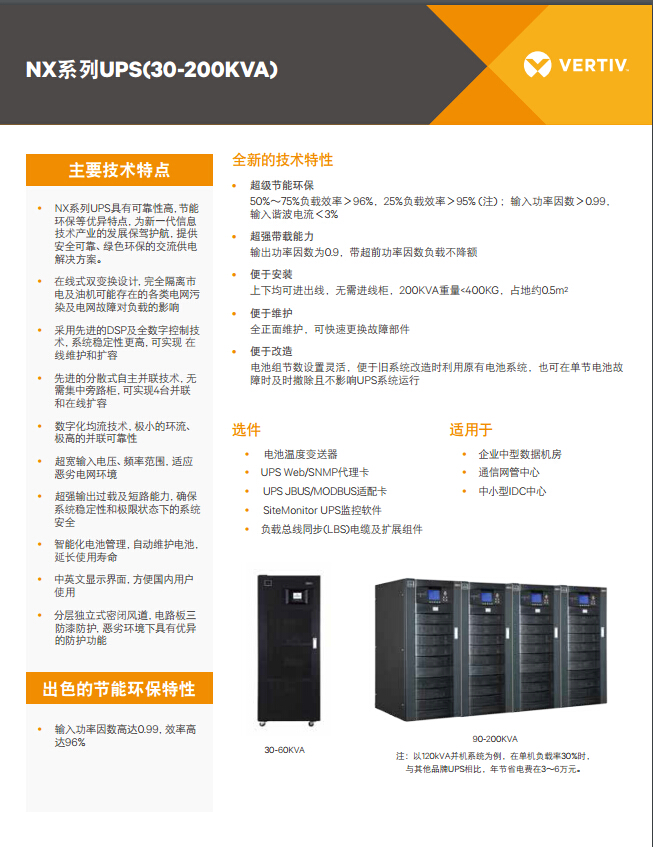 Vertiv Liebert NX 系列 UPS 具有可靠性高,節(jié)能環(huán)保等優(yōu)異特點(diǎn),為新一代信息技術(shù)產(chǎn)業(yè)的發(fā)展保駕護(hù)航,提供安全可靠、綠色環(huán)保的交流供電解決方案。